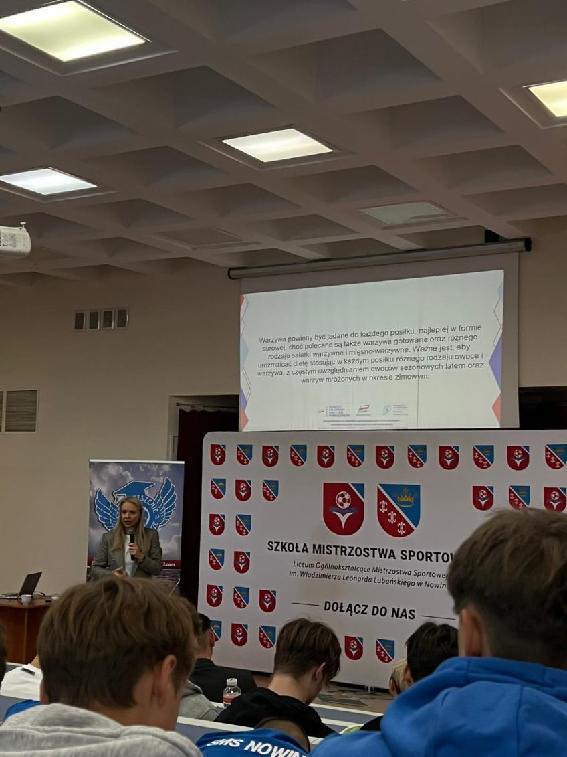 Podczas spotkania Pani dietetyk przedstawiła naszym uczniom, jak w świadomy sposób należy komponować posiłki, aby wspierały zdrowy rozwój sportowca.